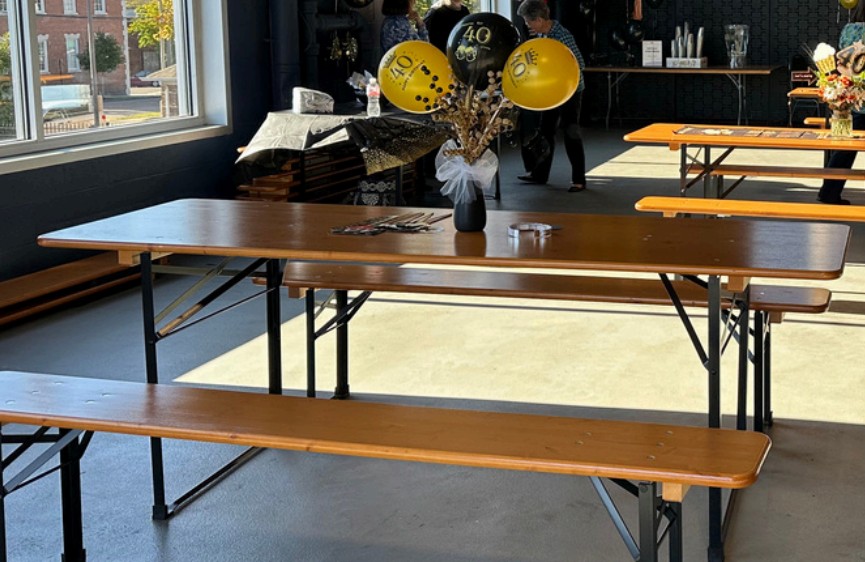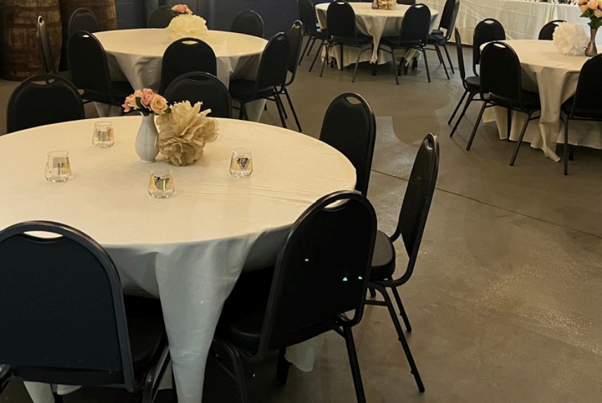 We have 60″ round tables with linens (black, ivory, & gold), 8 ft. rectangular tables with linens (black & ivory), and black banquet chairs available for a fee.